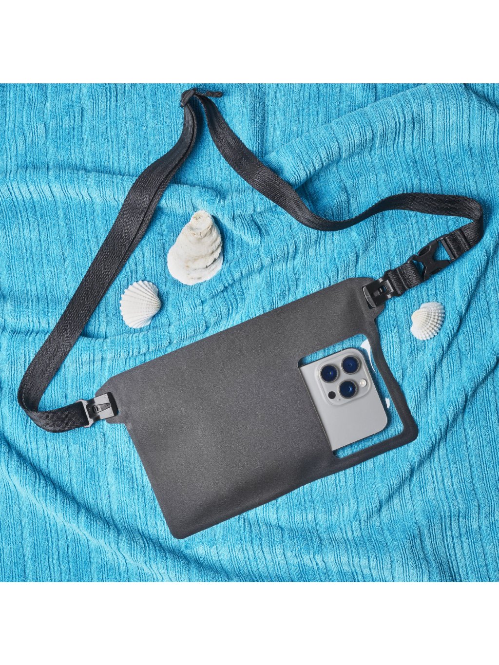 Vodotěsné pouzdro na mobil s dotykovým oknem, nastavitelným popruhem (pas/křížem přes tělo) a přístupem ke přednímu i zadnímu fotoaparátu – ideální na dovolenou, pláž i dobrodružství za každého počasí.