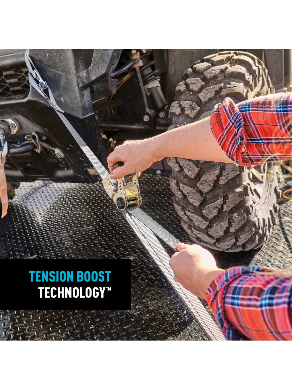 Když nastane čas na napnutí, inovativní konstrukce cívky umožňuje jednoduše otáčet a zavádět konec popruhu do spony. Patentovaná technologie Tension Boost Technology™ snižuje námahu při ráčnování na polovinu a téměř zdvojnásobuje napětí v popruhu, čímž zajišťuje hladký chod a dlouhou životnost.
