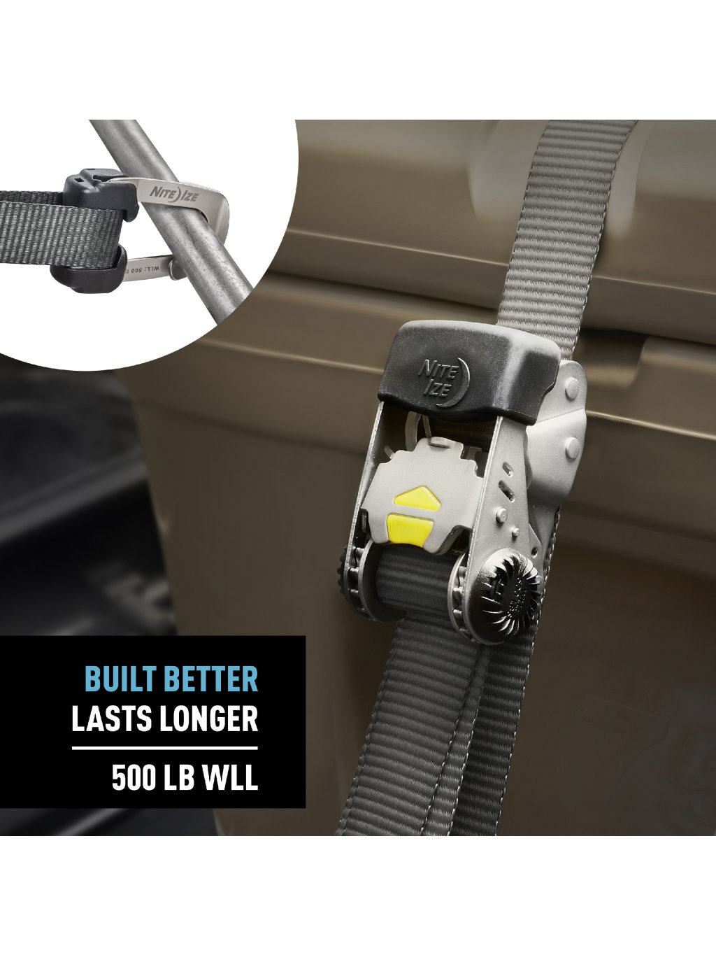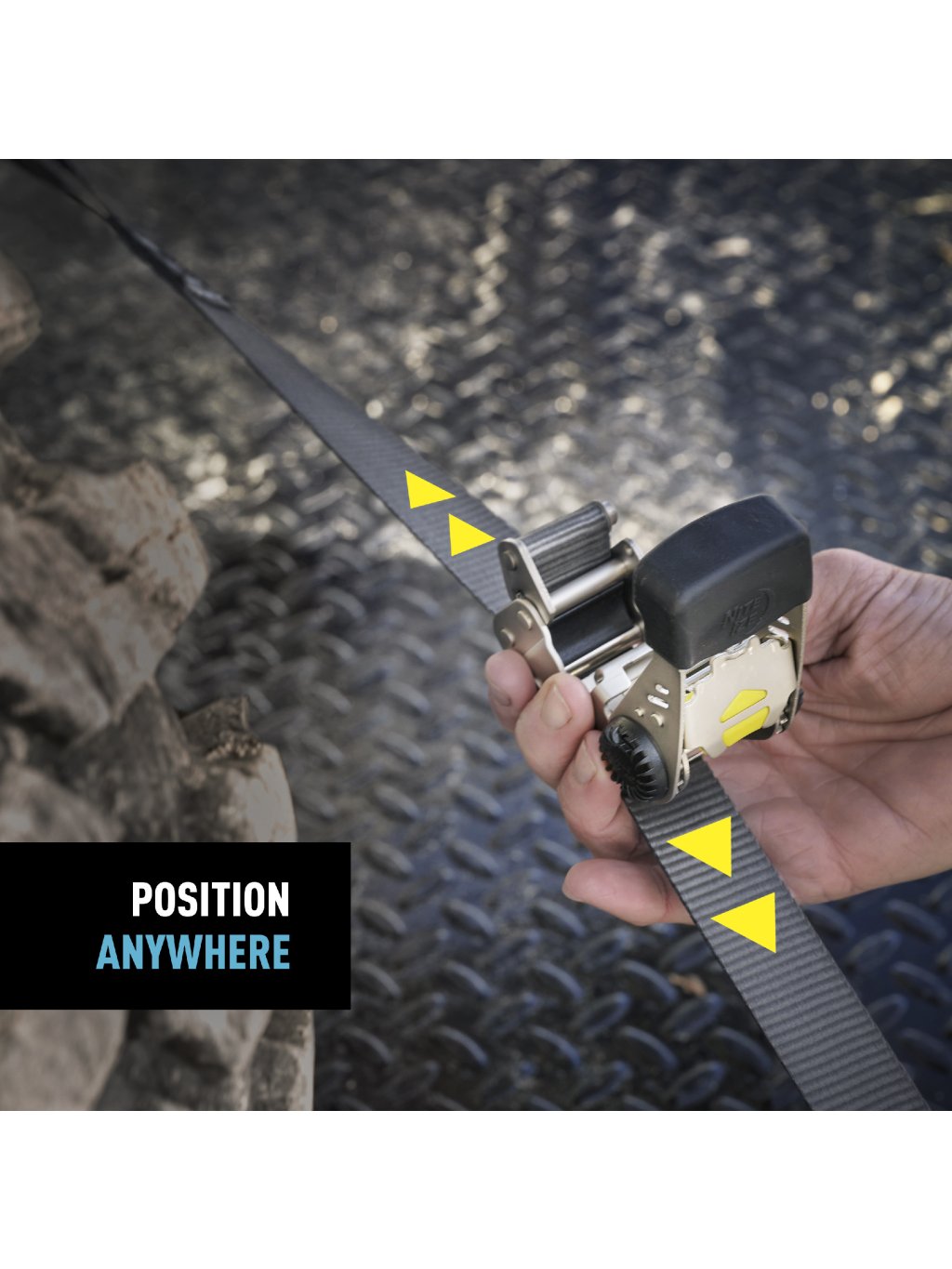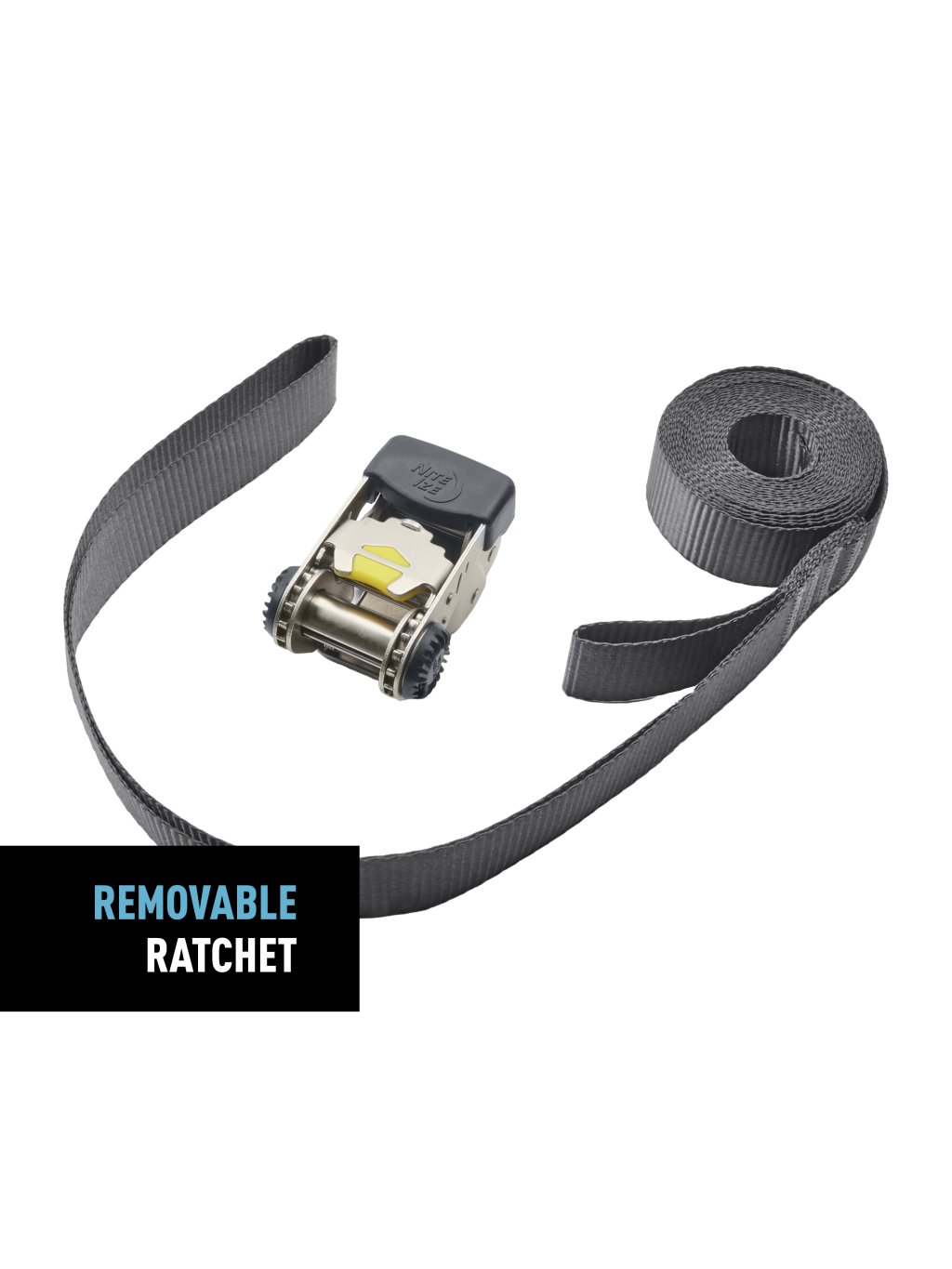 Systém obsahuje první odnímatelnou a nastavitelnou ráčnu, která umožňuje její umístění kdekoliv na popruhu pro snadný přístup a větší flexibilitu při upevňování středně těžkých nákladů (pracovní zatížení až 500 liber / cca 227 kg).
