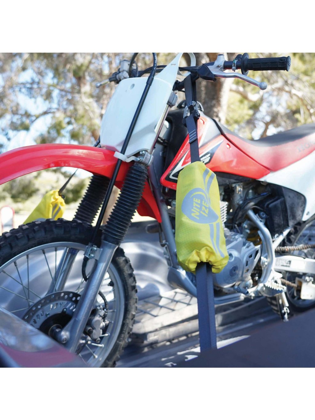 Po použití můžete celý systém uložit do 2 přiložených reflexních úložných vaků pro snadnou organizaci – nebo jeden vak během jízdy připevnit kolem spony a volného popruhu, čímž zabráníte plápolání a ochráníte sponu před větrem a nečistotami při delších převozech.